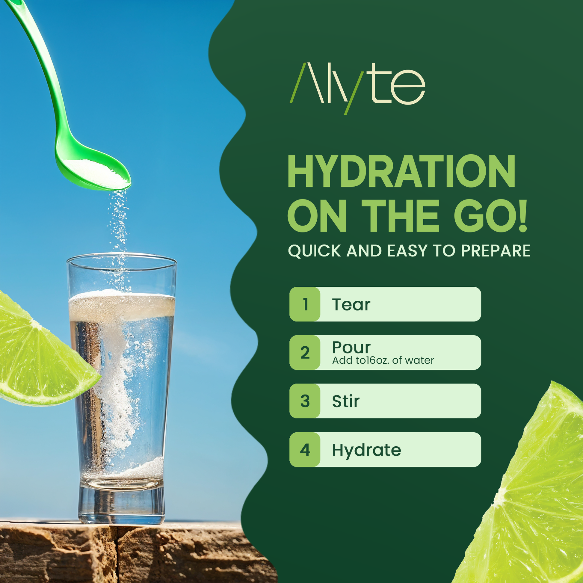 Mix 1 scoop of Alyte Electrolyte Powder with 16-20 oz of water.