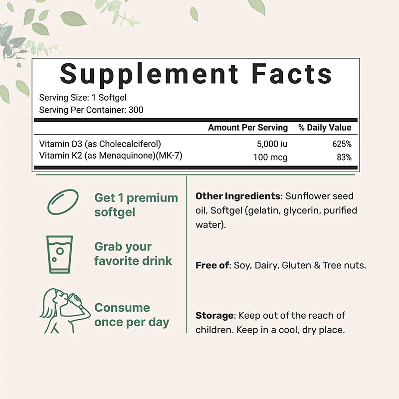 Bone Health: Vitamin D3 enhances calcium absorption, while K2 directs it to bones and teeth—where it's needed most